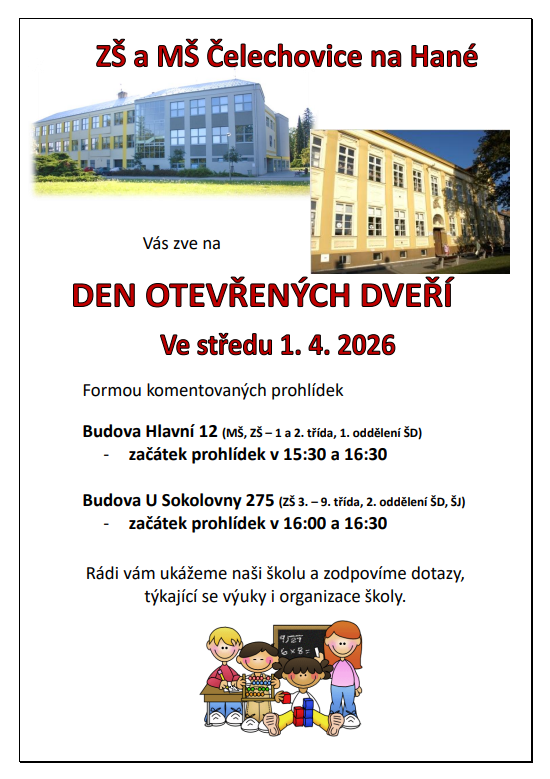 ZŠ a MŠ Čelechovice na Hané Vás srdečně zve na Den otevřených dveří formou komentovaných prohlídek, který se uskuteční ve středu 1.4.2026. Budova Hlavní 12 (MŠ, ZŠ [...]